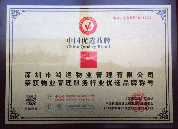 2018年9月30日,鴻運(yùn)物業(yè)被評(píng)為物業(yè)管理服務(wù)行業(yè)優(yōu)選品牌。中國(guó)優(yōu)選品牌促進(jìn)發(fā)展工程是為了深切貫徹黨中央、國(guó)務(wù)院和國(guó)家有關(guān)部委關(guān)于深化經(jīng)濟(jì)體制改革,加強(qiáng)中國(guó)民族品牌建設(shè)的若干文件精神,響應(yīng)中國(guó)廣大企業(yè)創(chuàng)建中國(guó)優(yōu)質(zhì)品牌的強(qiáng)烈要求,由社會(huì)各級(jí)權(quán)威媒體組織發(fā)起,并與中央電視臺(tái)聯(lián)合創(chuàng)建了《發(fā)現(xiàn)·品牌》欄目,整合現(xiàn)有政策、權(quán)威媒體、 網(wǎng)絡(luò)資源為中國(guó)優(yōu)質(zhì)品牌提供品牌提升和傳播的一體化窗口。鴻運(yùn)物業(yè)成功當(dāng)選,直接證明了鴻運(yùn)物業(yè)的實(shí)力與口碑。 在中國(guó)優(yōu)選品牌促進(jìn)發(fā)展工程官方網(wǎng)站上,可以搜索鴻運(yùn)物業(yè)查找到相關(guān)信息,亦可點(diǎn)擊下方鏈接,直接查看詳情: http://www.cctvfxpp.com/brand/detail/sn-YXPP0013229.html?ref=www