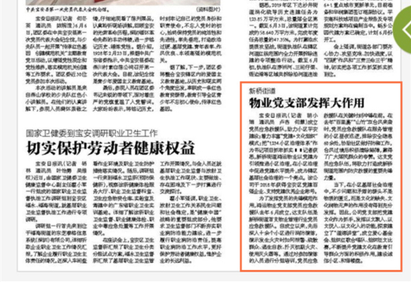 6月11日,寶安日報以“新橋街道物業(yè)黨支部發(fā)揮大作用”為題,對我司黨支部工作進行報道。以下為報道全文: (寶安日報數(shù)字版·新聞?wù)故尽?(寶安日報紙質(zhì)版·新聞?wù)故?↑↑) 鴻運物業(yè)黨支部將再接再厲,充分發(fā)揮黨支部的帶頭作用和黨員的模范作用,將黨建融入物業(yè)管理工作中,助力社區(qū)建設(shè),助力基層治理,助力社會安定!